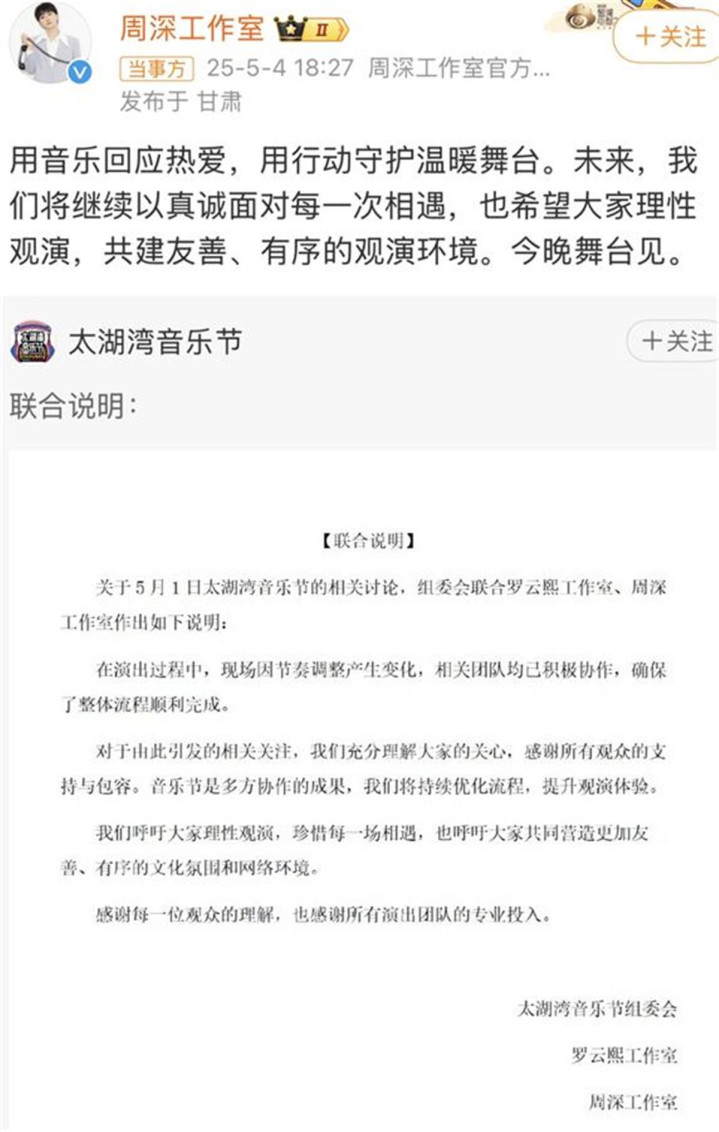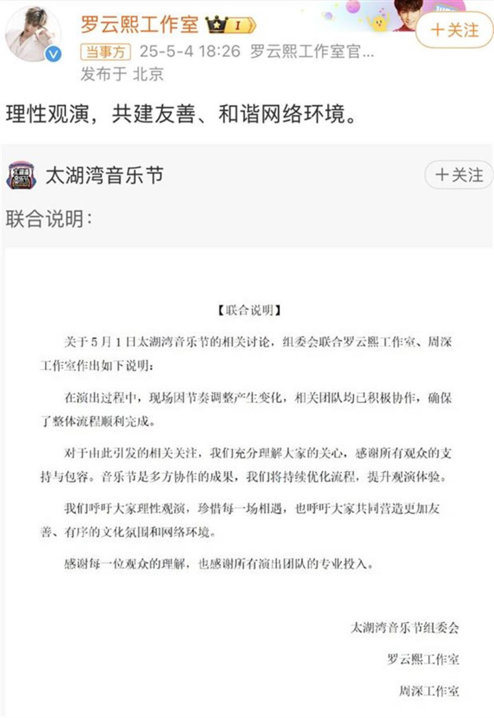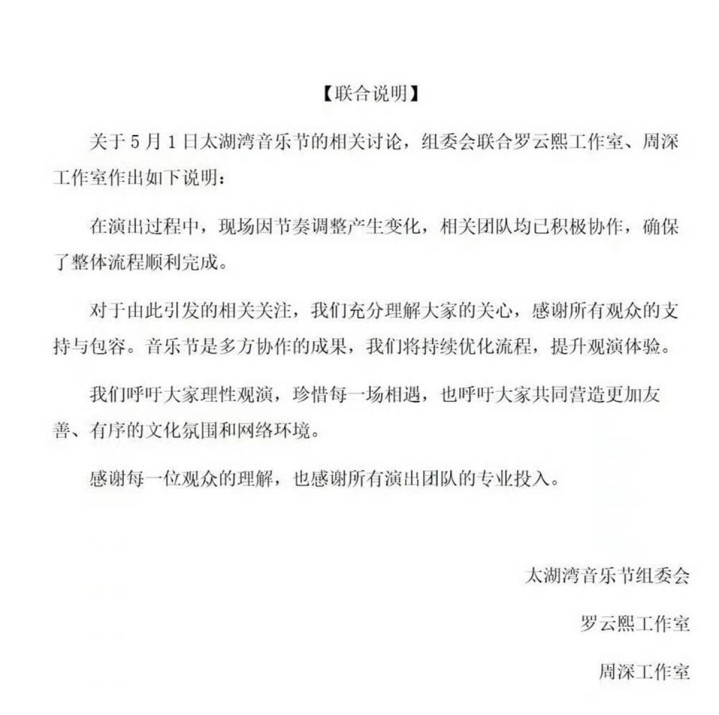 5月4日18:22,太湖湾音乐节官方账号发文,称“就5月1日太湖湾音乐节的相关讨论”,音乐节组委会联合罗云熙工作室、周深工作室作出如下说明: